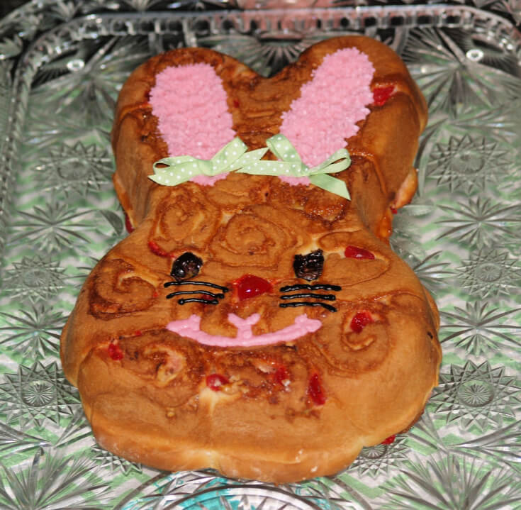 NOTE: This is a cute bunny cake when decorated with powdered sugar icing, adding eyes and whiskers. Sometimes before putting rolls in pan, I place a cherry in the pan for the nose and a HALF of a date for each eye.