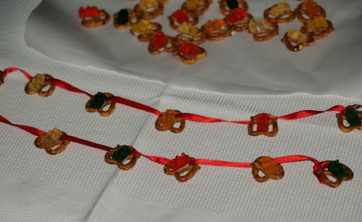 Weave 1 piece of ribbon through the holes in the decorated pretzels.