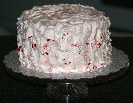 Frost top and sides with fluffy frosting; sprinkle top and sides with crushed peppermint candy.