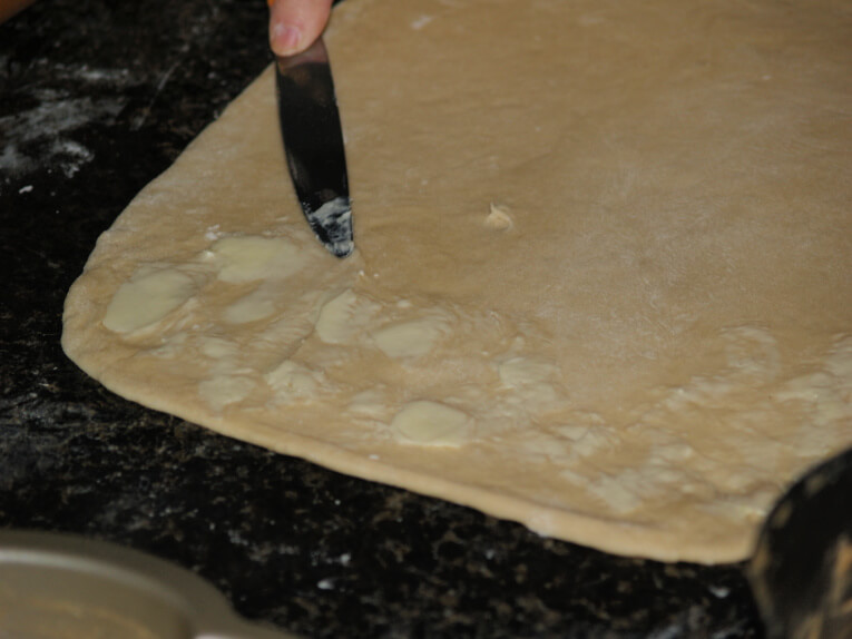 Roll the dough on lightly floured surface to a 16 by 12 inch rectangle.