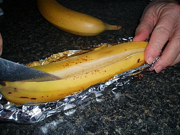 Place each banana with stuffed side up in a piece of aluminum foil folded to resemble a boat.