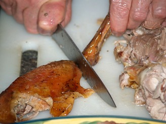 The next step when learning how to carve a turkey is to remove the wings by bending them back and cutting through the joints at the breast; cut tips from the wings at joints. The only part left now is the favorite of most people; the white breast meat. Starting at one side where the wing was attached, make a horizontal slice all the way to the backbone. Continue slicing working up to the center of the breast. Rotate carcass to other side and cut the other side of breast in the same manner.