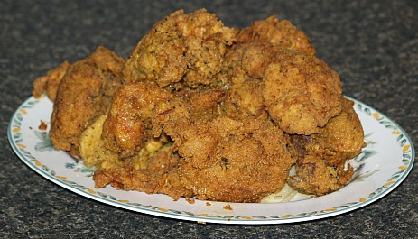 OPTION: It is easy to UNDERCOOK fried chicken if you are not using a temperature controlled fryer. The oil gets too hot, browns the outside leaving the inside raw. I prevent this by precooking before frying. I precook by boiling in water until almost done and then cool. This way I can also use the chicken broth for recipes.