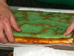 When cold, place pink layer on a tray. Heat preserves and strain. Spread half of strained preserves on top of the pink cake.